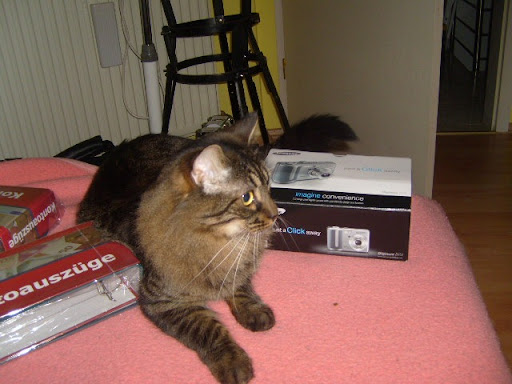 Aber wie kriegen wir in rauf in die Wohnung??? Natürlich NICHT im Korb. Markus lief dann vor und machte die Haustüre auf, ich schnappte mit den riesen Kater (er wiegt mittlerweile fast 7 Kilo - normal für eine Maine Coon) und lief in einem Affentempo über die Strasse, damit er mir nicht von Arm springt. Gott sei Dank haben wir das geschafft. Flame fands, glaube ich, mächtig aufregend. So hat er jedenfalls geguckt :-)